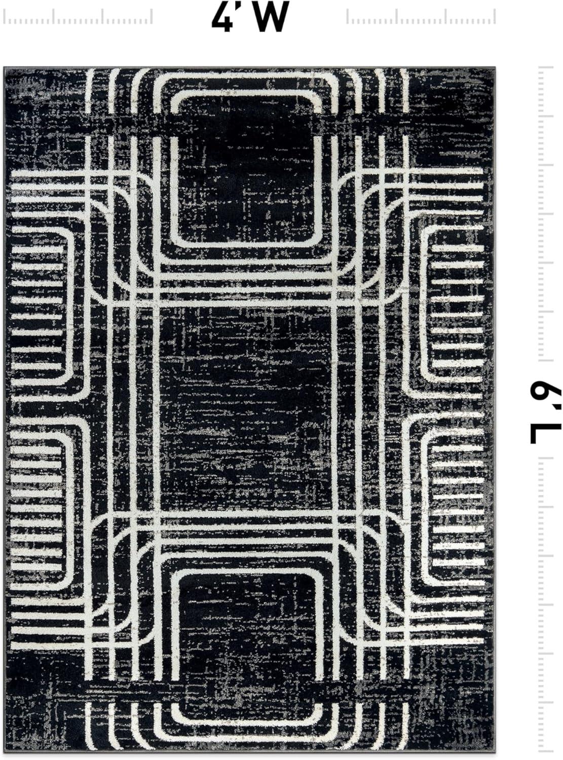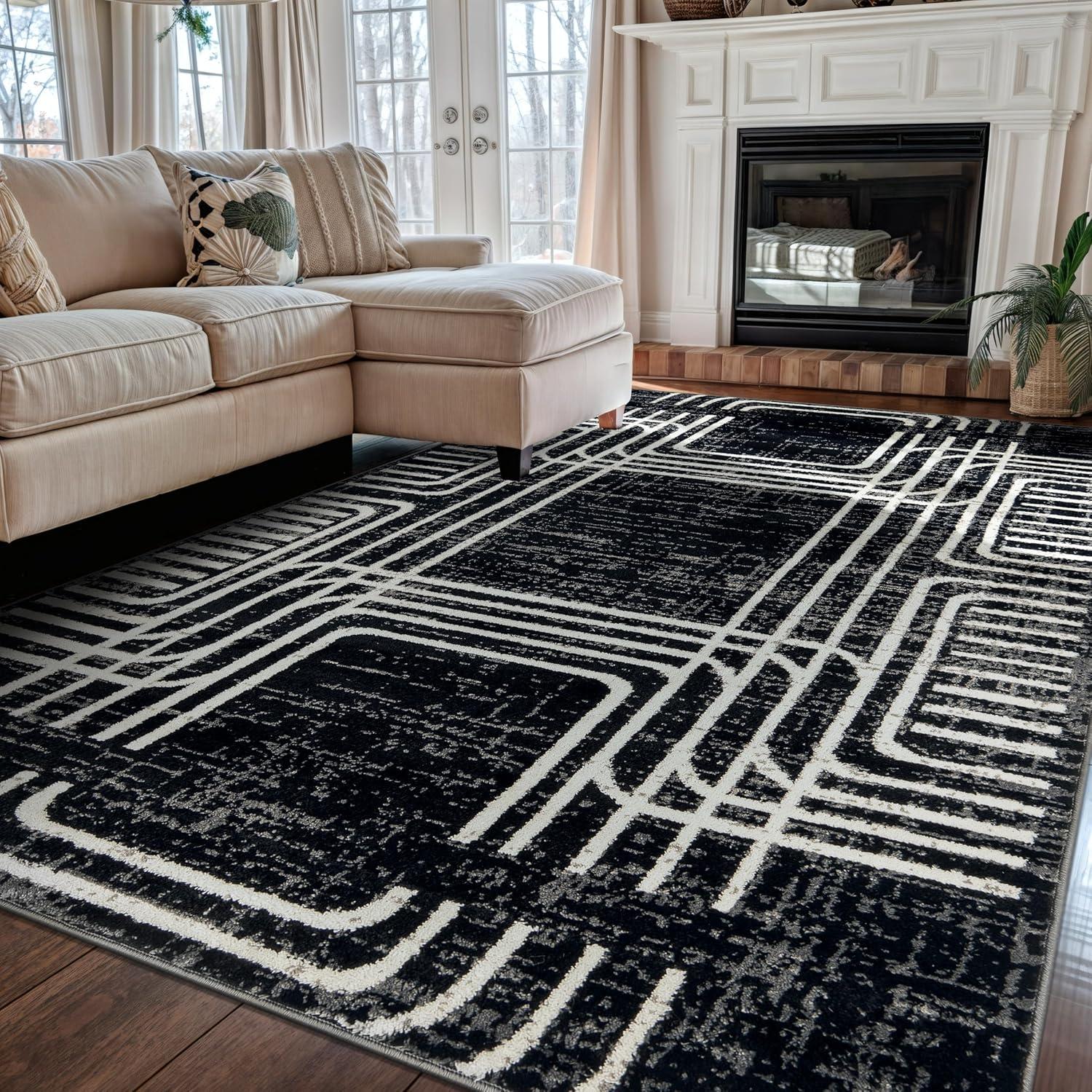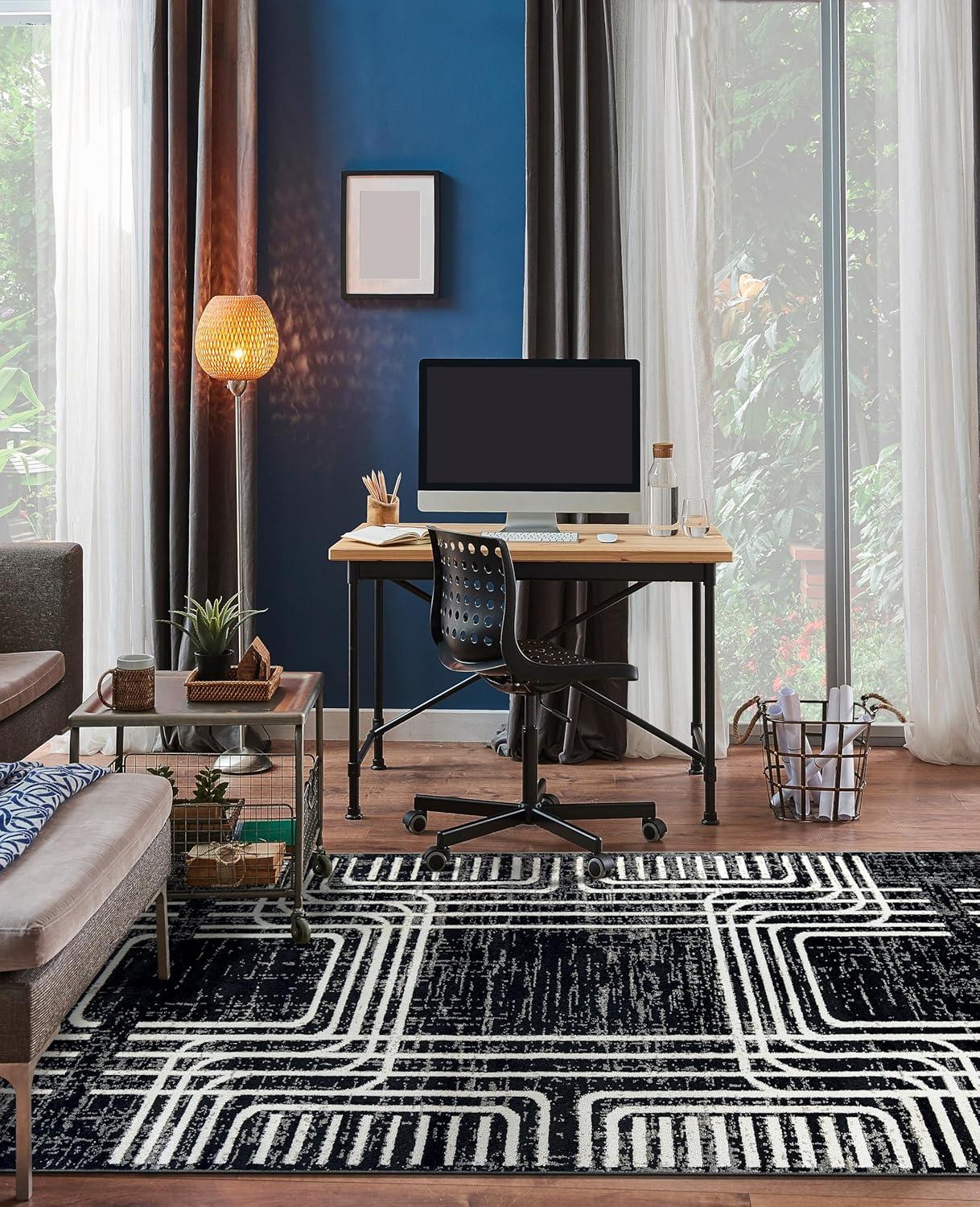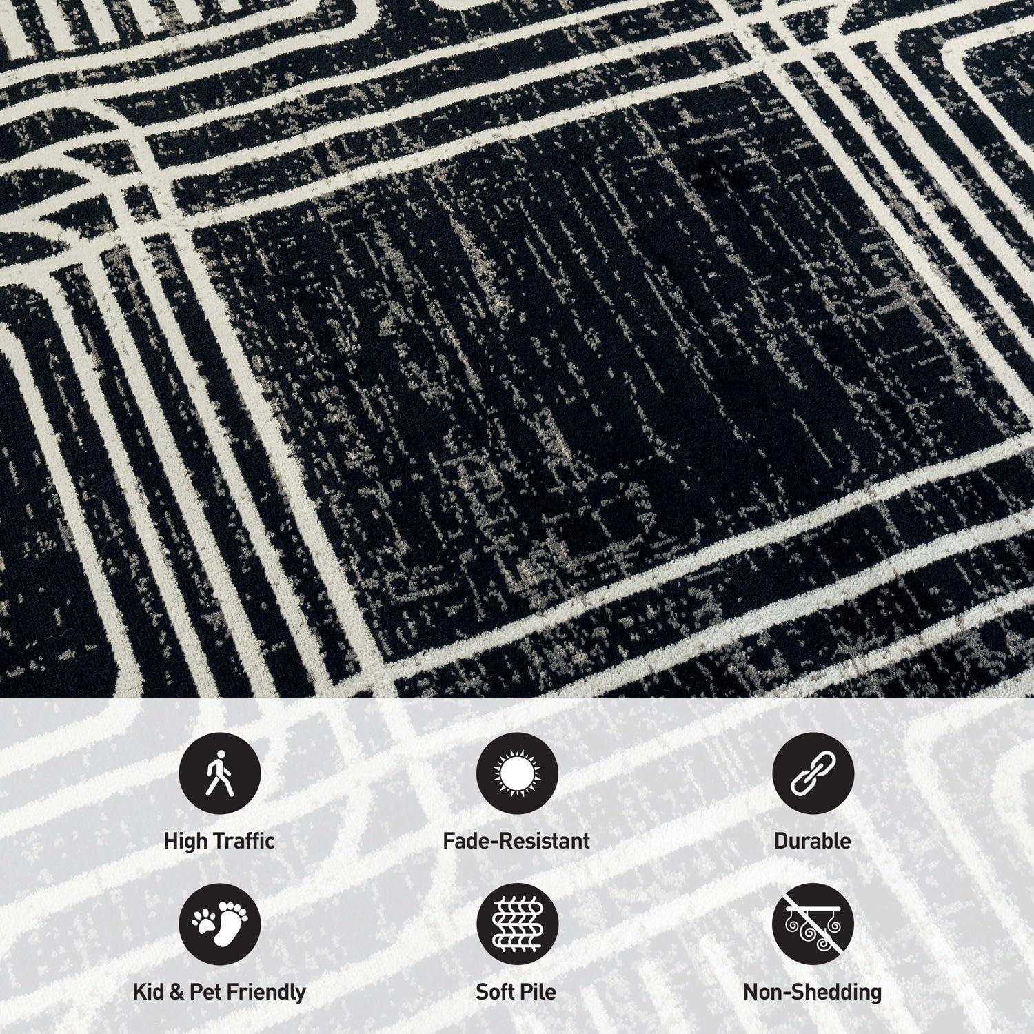 Enhance your décor with this modern geometric rug, designed to add structure and bold contrast to your space. The black and ivory color palette complements minimalist, contemporary, and modern interiors. Built for durability, it features a 0.39-inch pile height, making it easy to clean and perfect for busy households. The stain-resistant, no-shedding fibers ensure long-lasting beauty in any room.