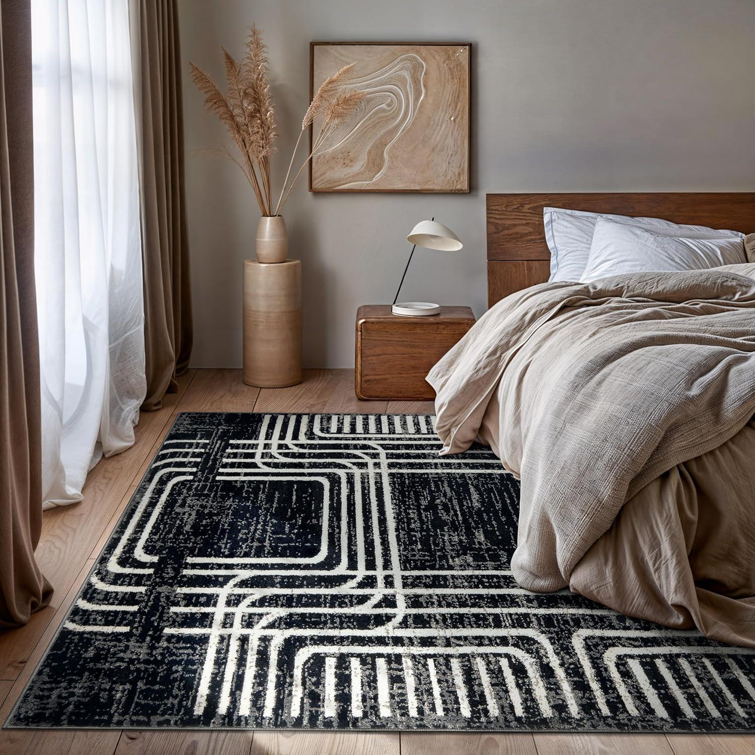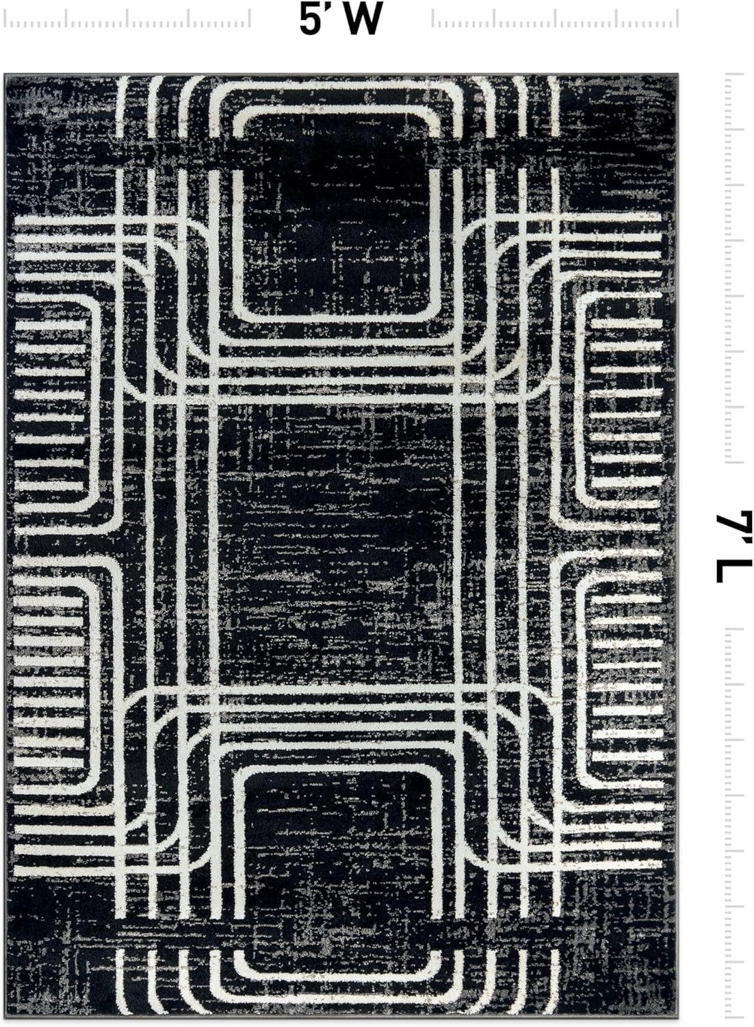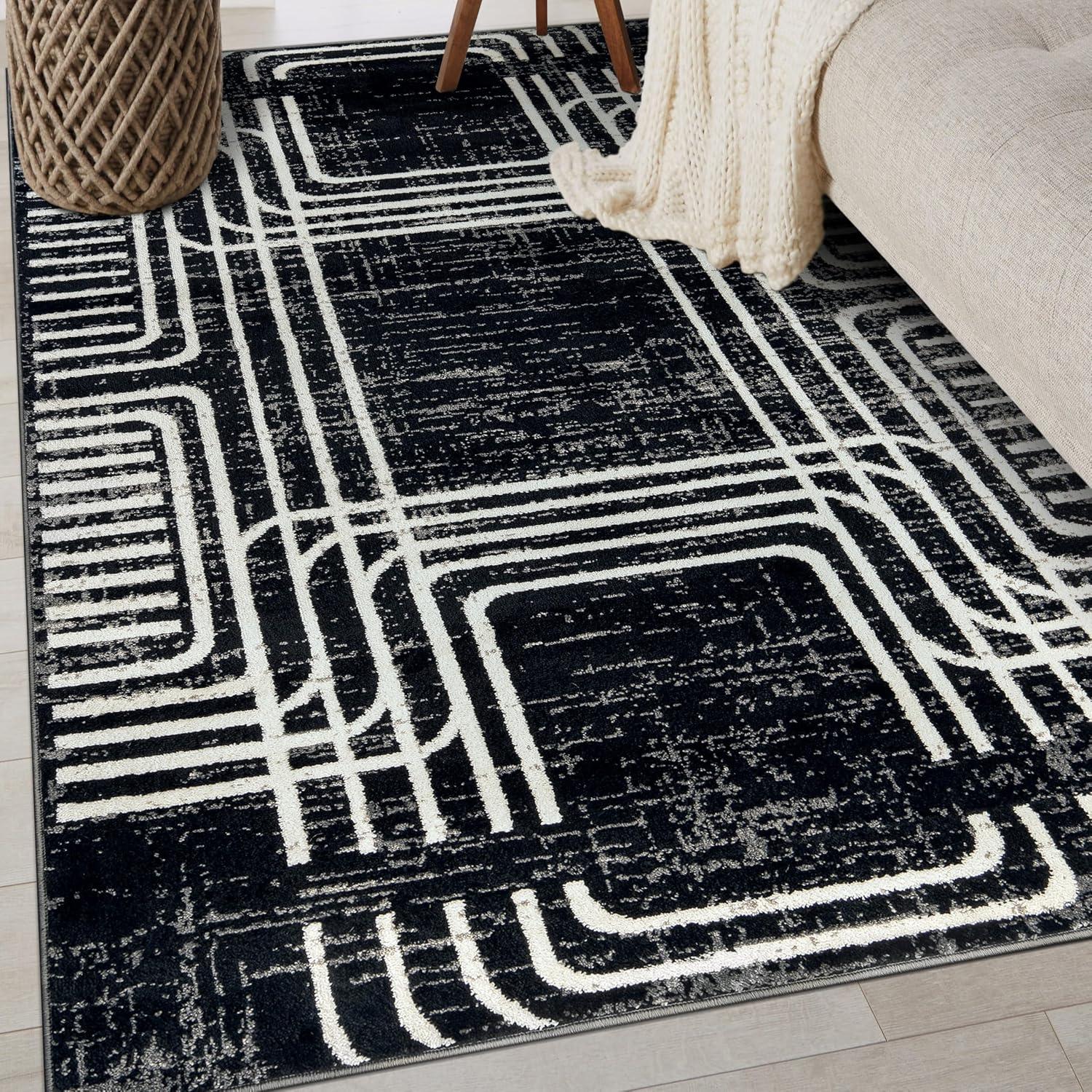 Rugshop Black and White Geometric Area Rug – Abstract Curved Line and Square Pattern Carpet for Living Room, Bedroom, or Office – Contemporary Soft Floor Décor 5′ x 7′ Black(Black)