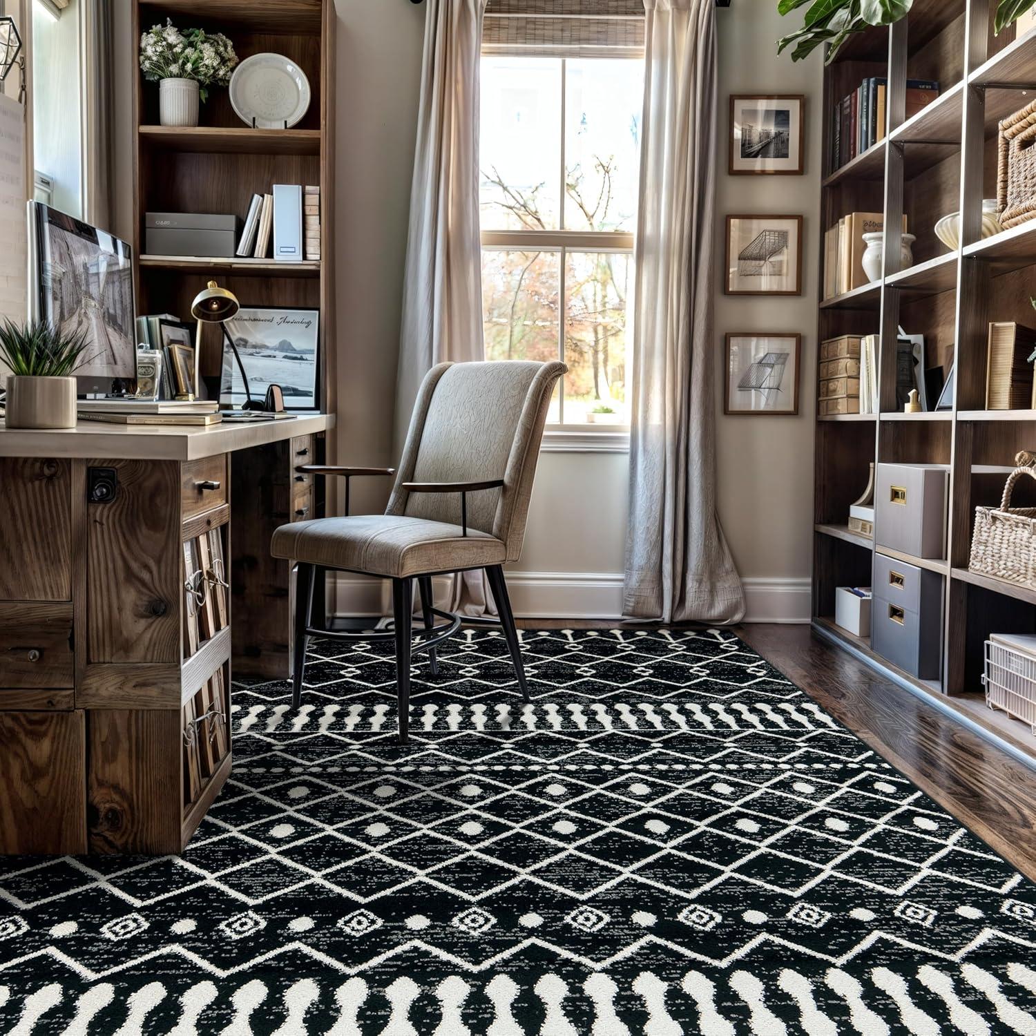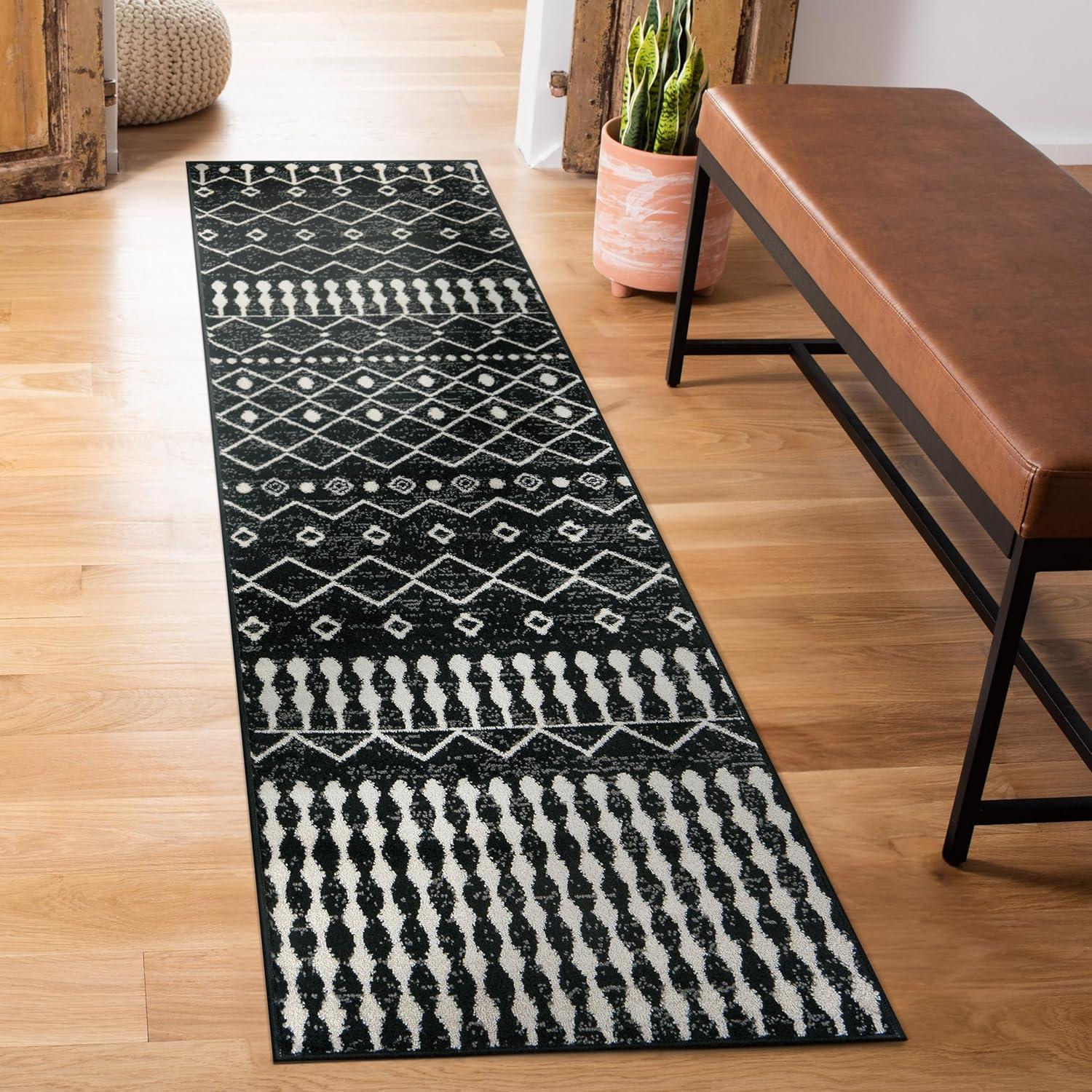 Make a statement with this geometric rug, where bold lines and crisp black and ivory tones bring a contemporary edge to any space. Designed with a 0.39-inch pile height, it provides a sleek look while remaining easy to maintain. Crafted from stain-resistant, durable fibers, this rug is perfect for high-traffic areas and everyday use.
