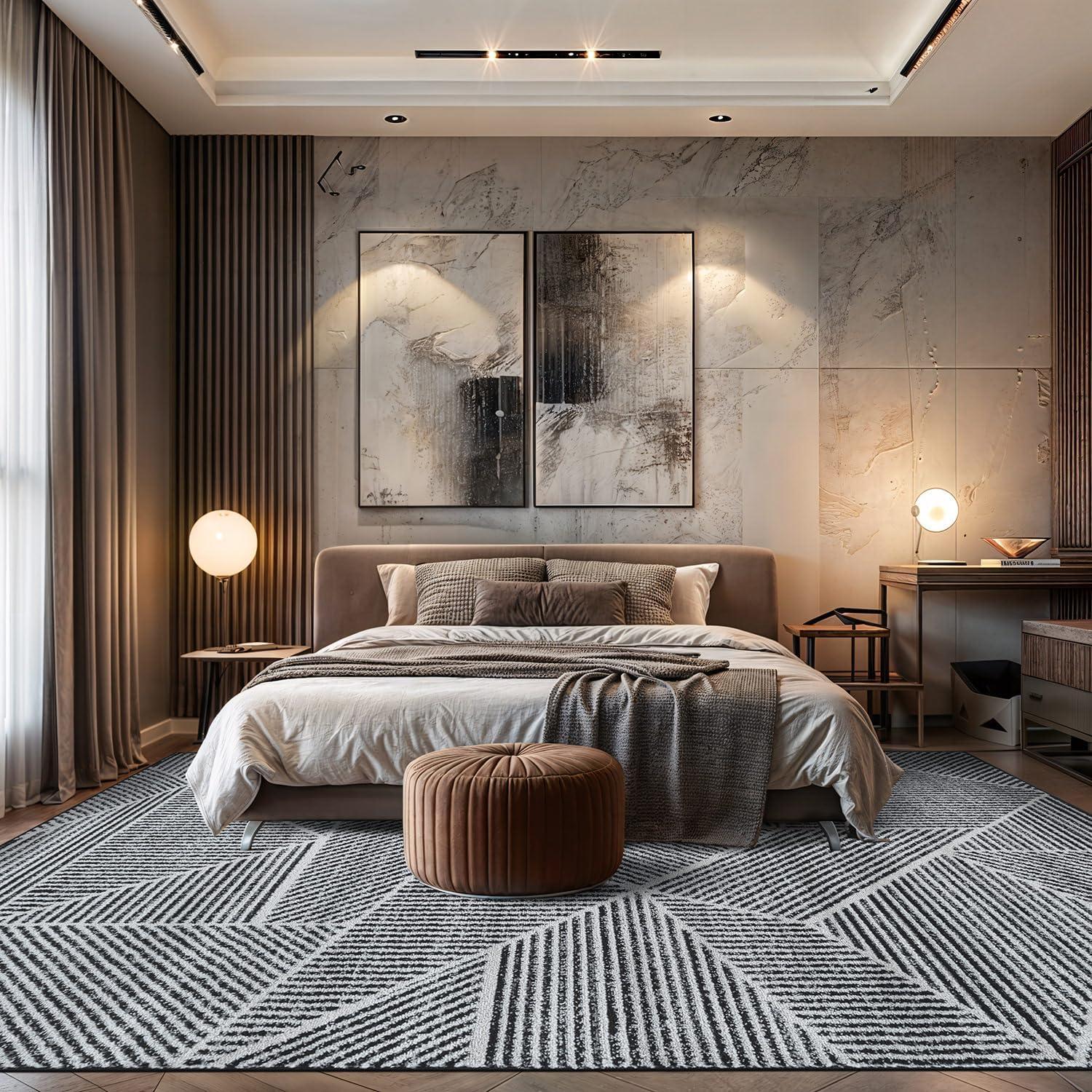Enhance your home's ambiance with our modern geometric striped minimalist-style area rug, designed in a captivating palette of ivory, beige, and brown. This geometric area rug seamlessly marries comfort with contemporary refinement. With its plush 0.39-inch pile height, it delivers a luxurious underfoot sensation and facilitates effortless maintenance through spot cleaning and vacuuming. Precision-engineered from top-quality polypropylene fibers and matched with a robust jute backing, this rug ensures both longevity and timeless visual appeal.