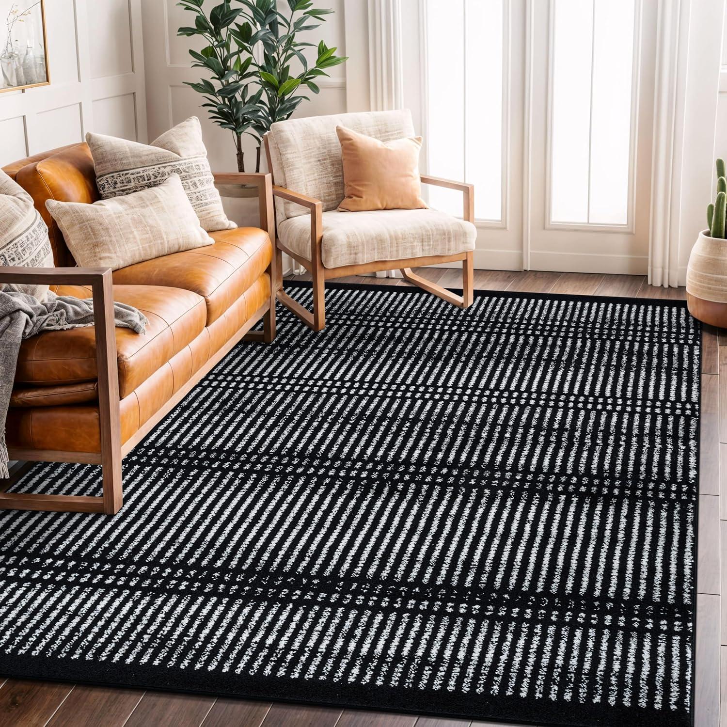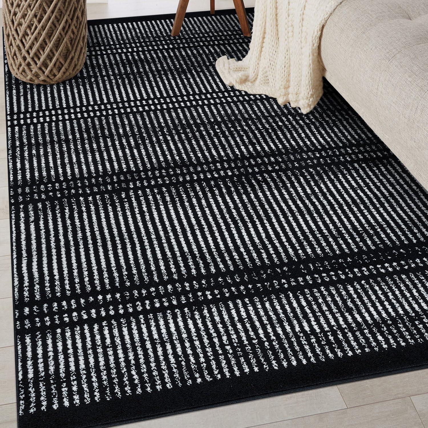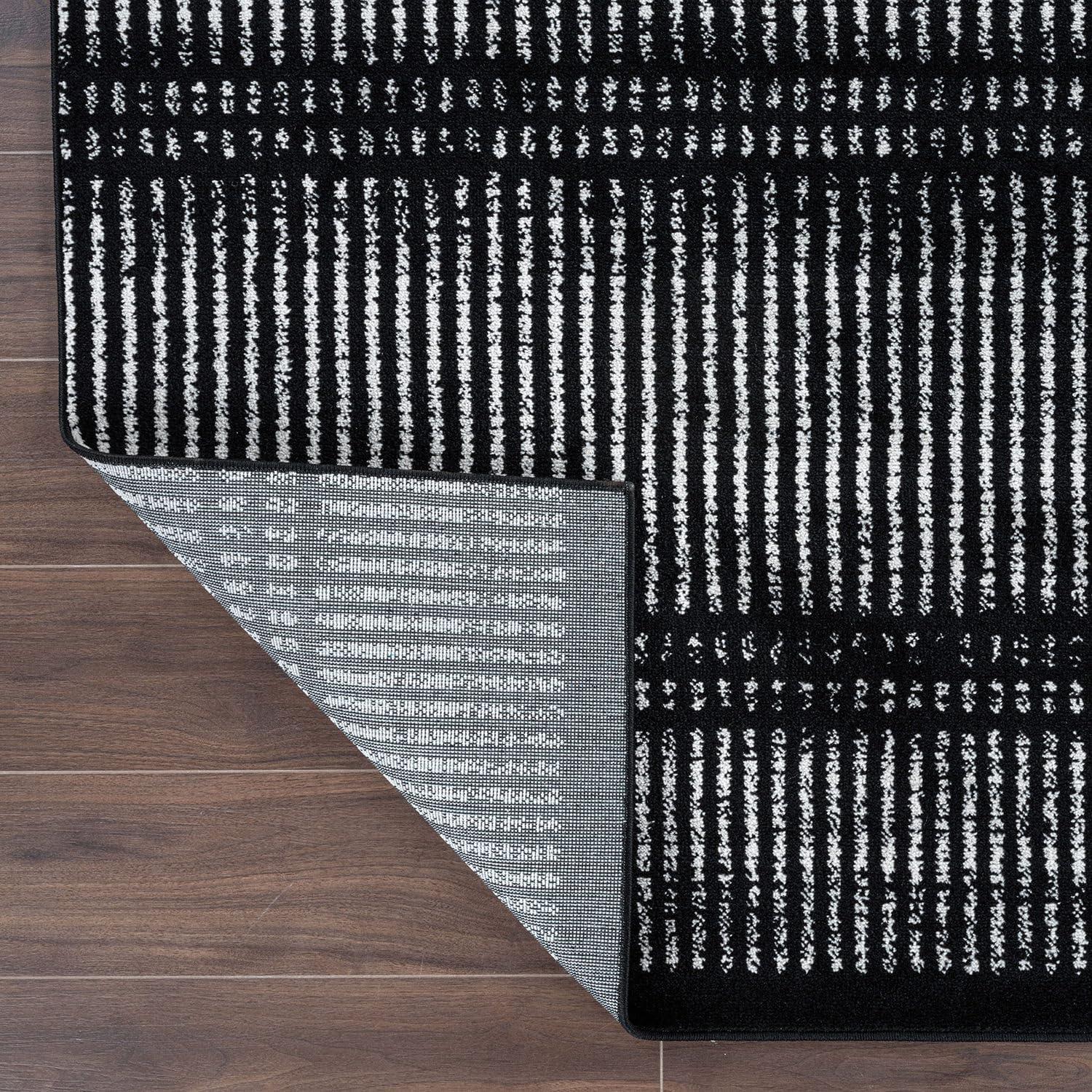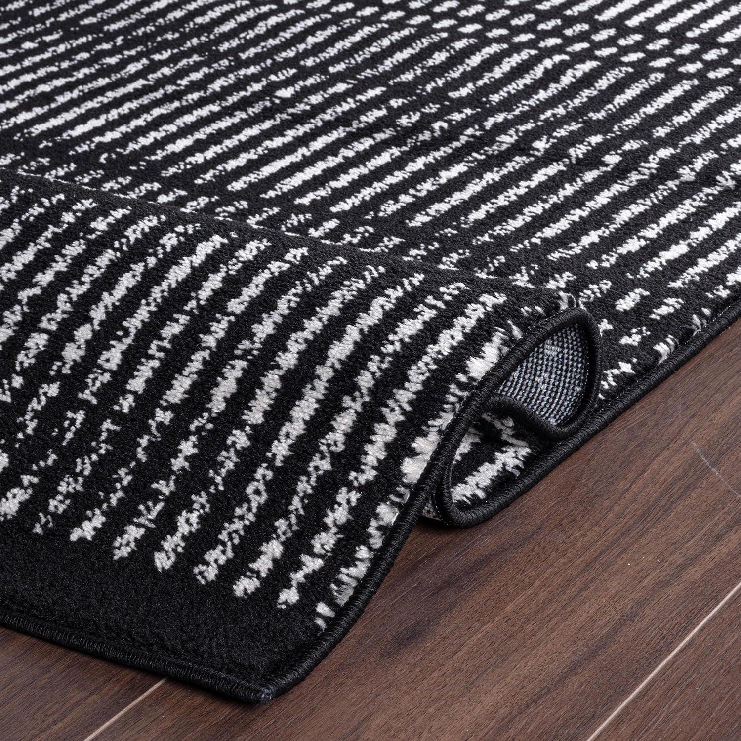 Elevate your home decor with our contemporary modern striped area rug in ivory and black. Designed to provide the perfect balance of comfort and style, this modern area rug boasts a luxurious 0.39-inch pile height, offering a plush and inviting texture that enhances the ambiance of any room. It's not just aesthetically pleasing; practicality is built-in, with hassle-free spot cleaning and vacuuming for easy maintenance. This striped area rug is a testament to craftsmanship, meticulously woven from top-tier polypropylene fibers, and its robust jute backing ensures both resilience and beauty. It promises a rug that stands the test of time while adding a touch of contemporary elegance to your space. Revitalize your living area with our modern striped area rug, where comfort meets sophistication and style meets durability. Redefine your home's aesthetic and enjoy the lasting impression this exceptional rug will make on your decor.