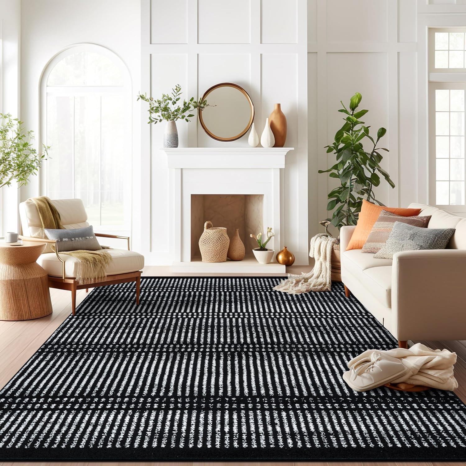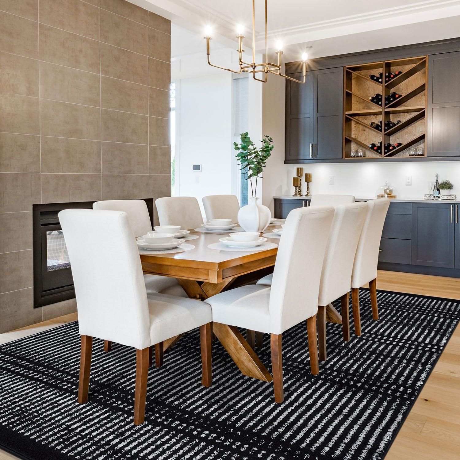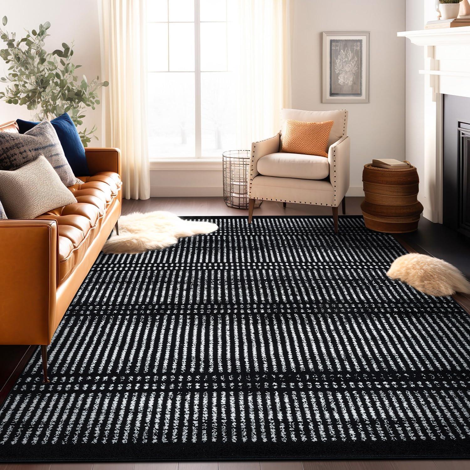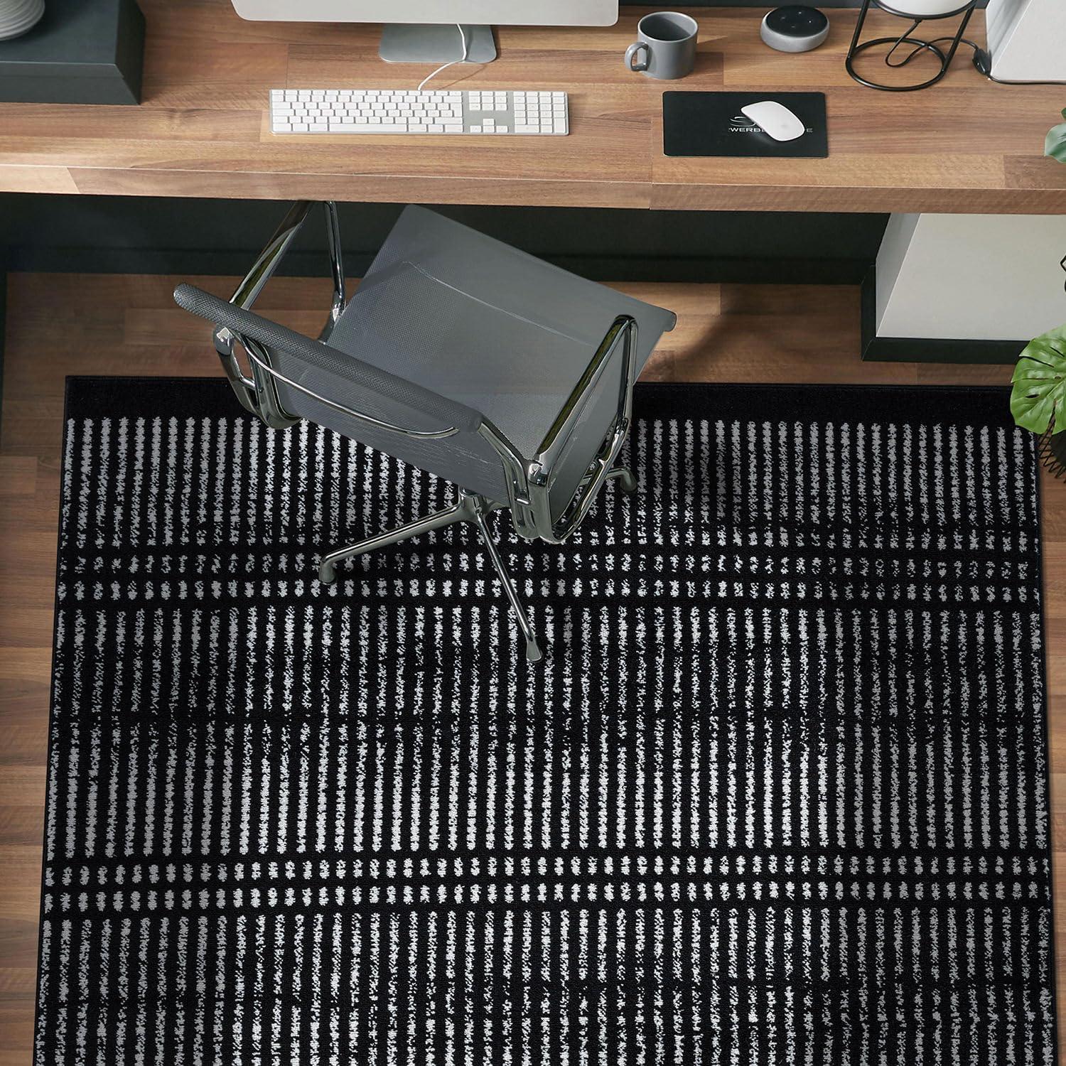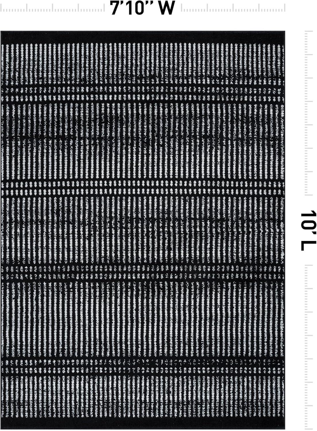 Elevate your home decor with our contemporary modern striped area rug in ivory and black. Designed to provide the perfect balance of comfort and style, this modern area rug boasts a luxurious 0.39-inch pile height, offering a plush and inviting texture that enhances the ambiance of any room. It's not just aesthetically pleasing; practicality is built-in, with hassle-free spot cleaning and vacuuming for easy maintenance. This striped area rug is a testament to craftsmanship, meticulously woven from top-tier polypropylene fibers, and its robust jute backing ensures both resilience and beauty. It promises a rug that stands the test of time while adding a touch of contemporary elegance to your space. Revitalize your living area with our modern striped area rug, where comfort meets sophistication and style meets durability. Redefine your home's aesthetic and enjoy the lasting impression this exceptional rug will make on your decor.