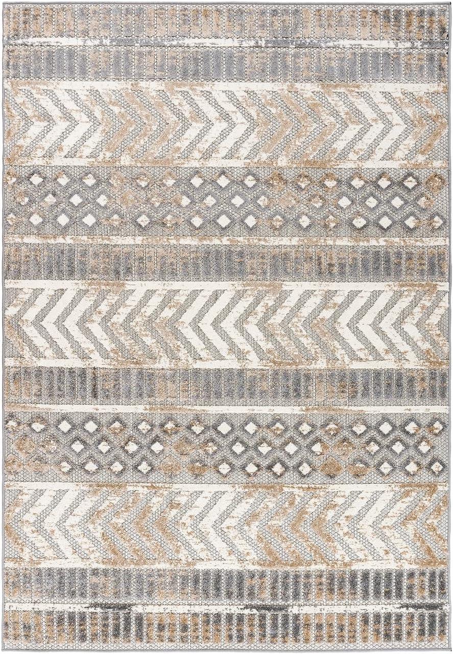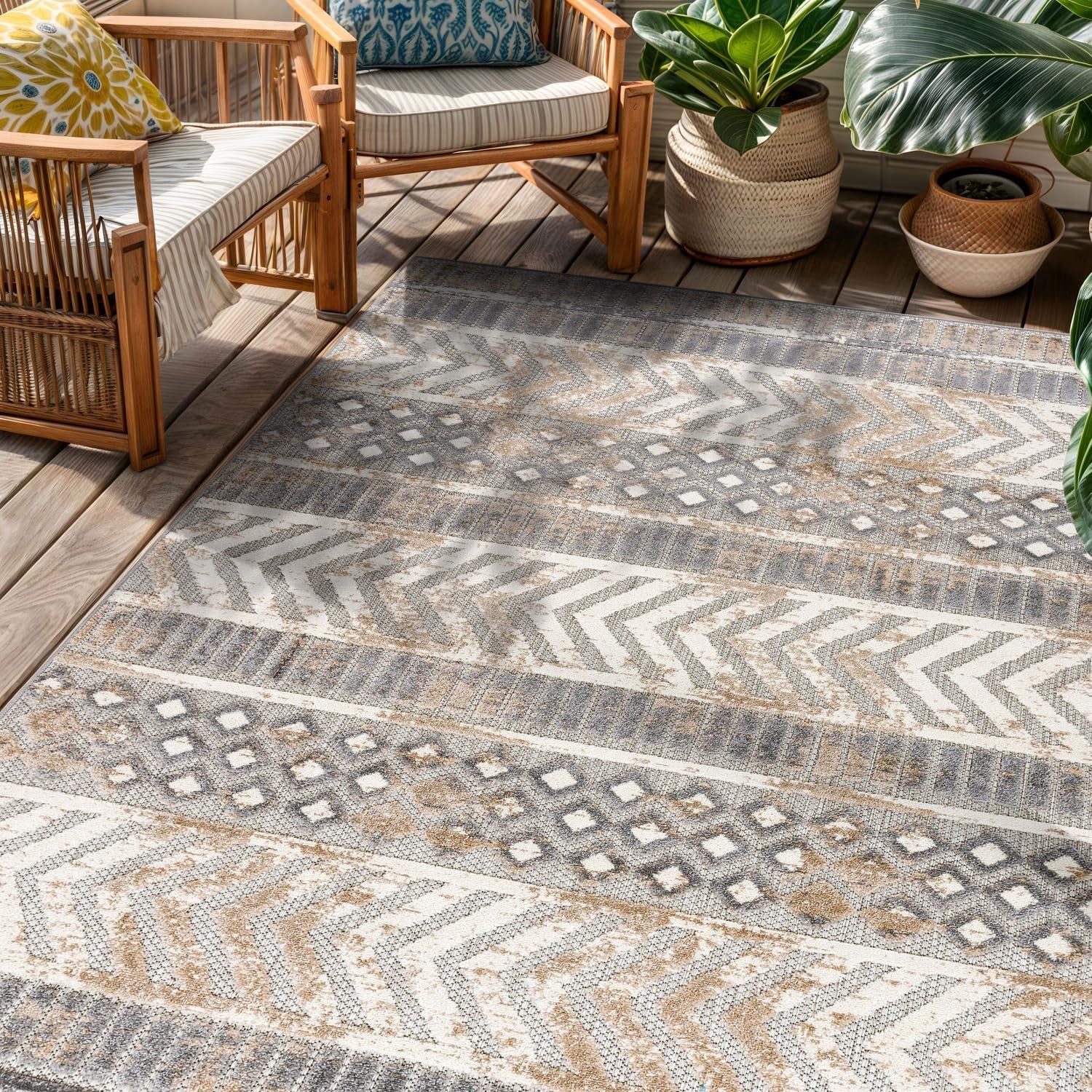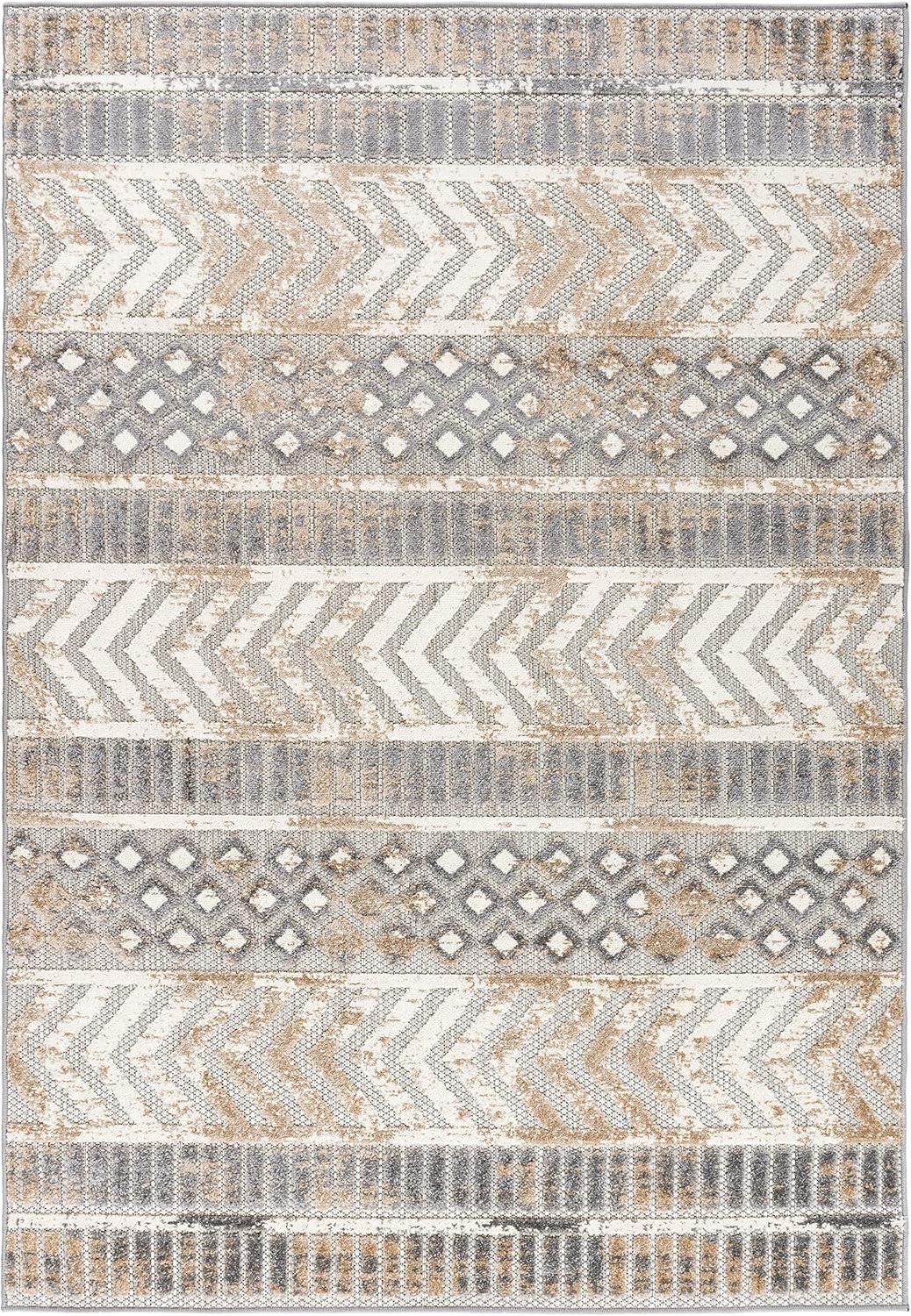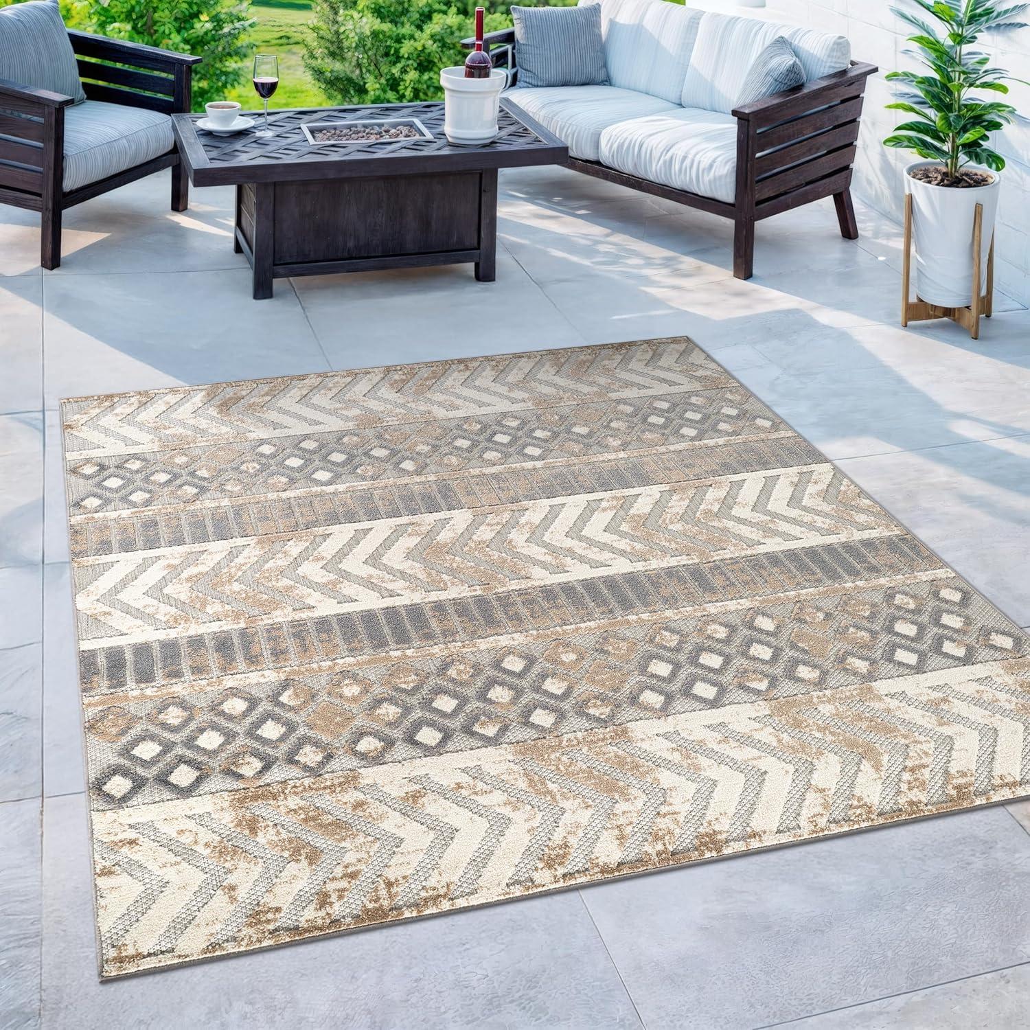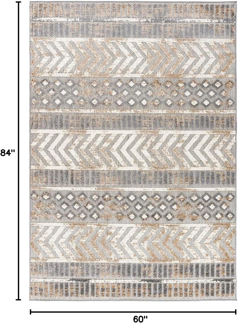 Rugshop Distressed Geometric Indoor/Outdoor Beige Area Rug Modern Tribal Stripe, Durable Stain Resistant Perfect for Patio, Backyard, Deck and Outdoor Lounge 5′ x 7′(Beige)