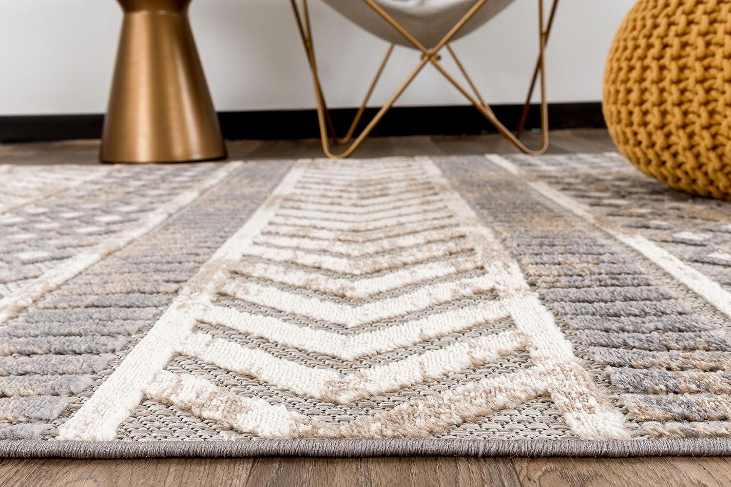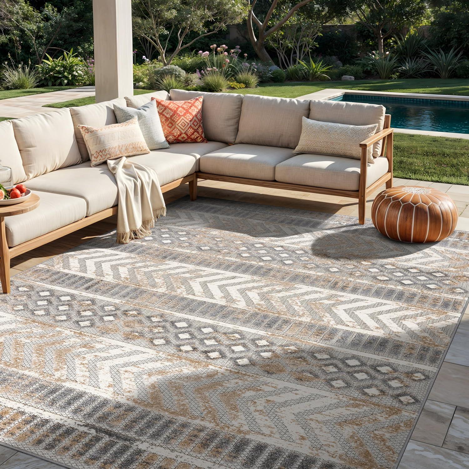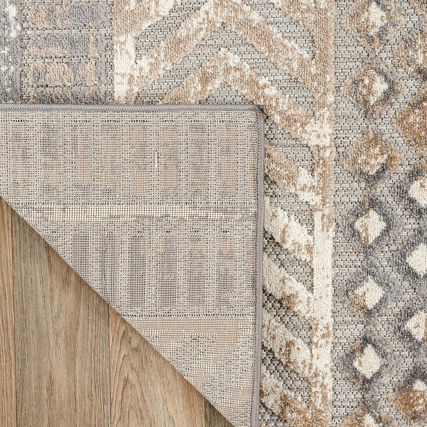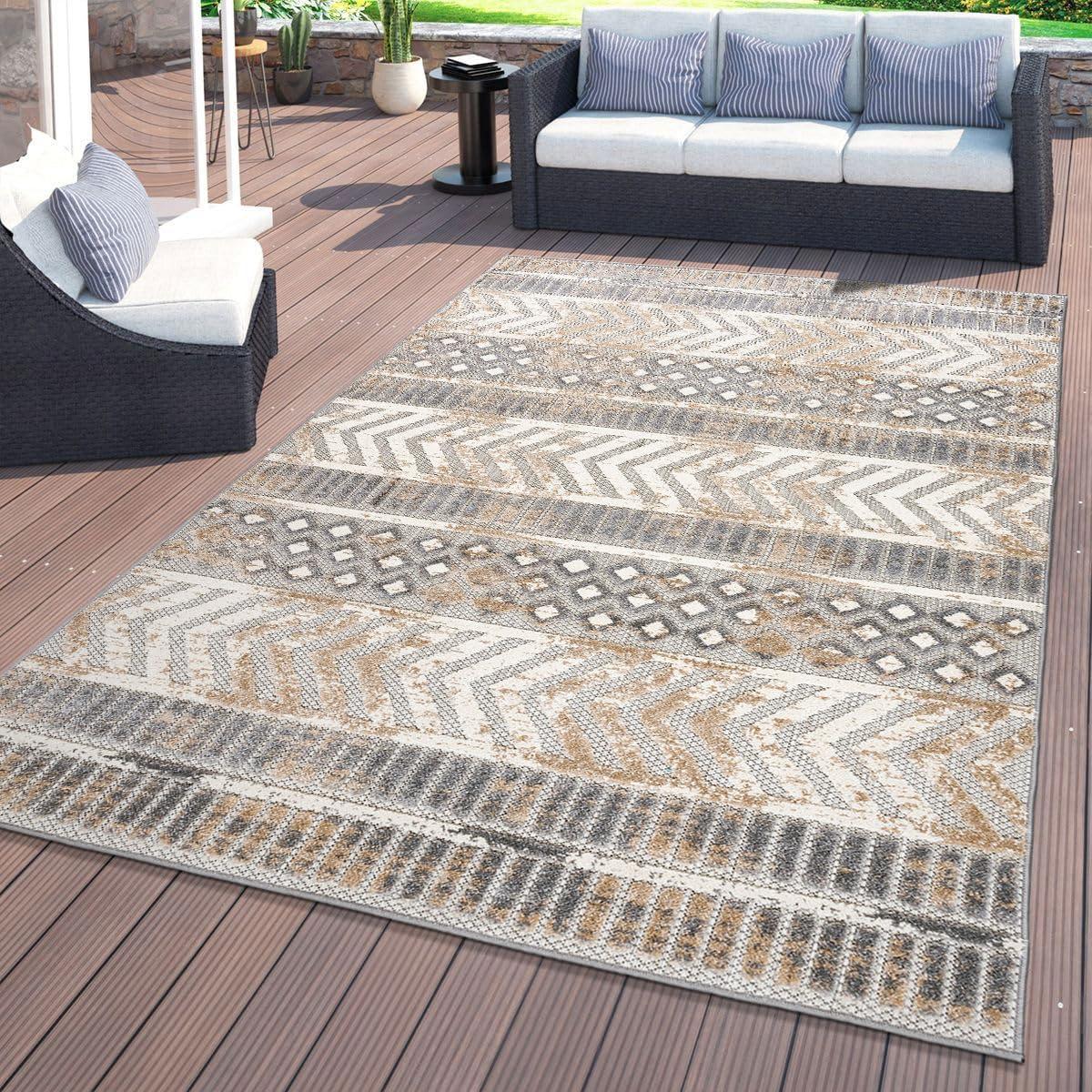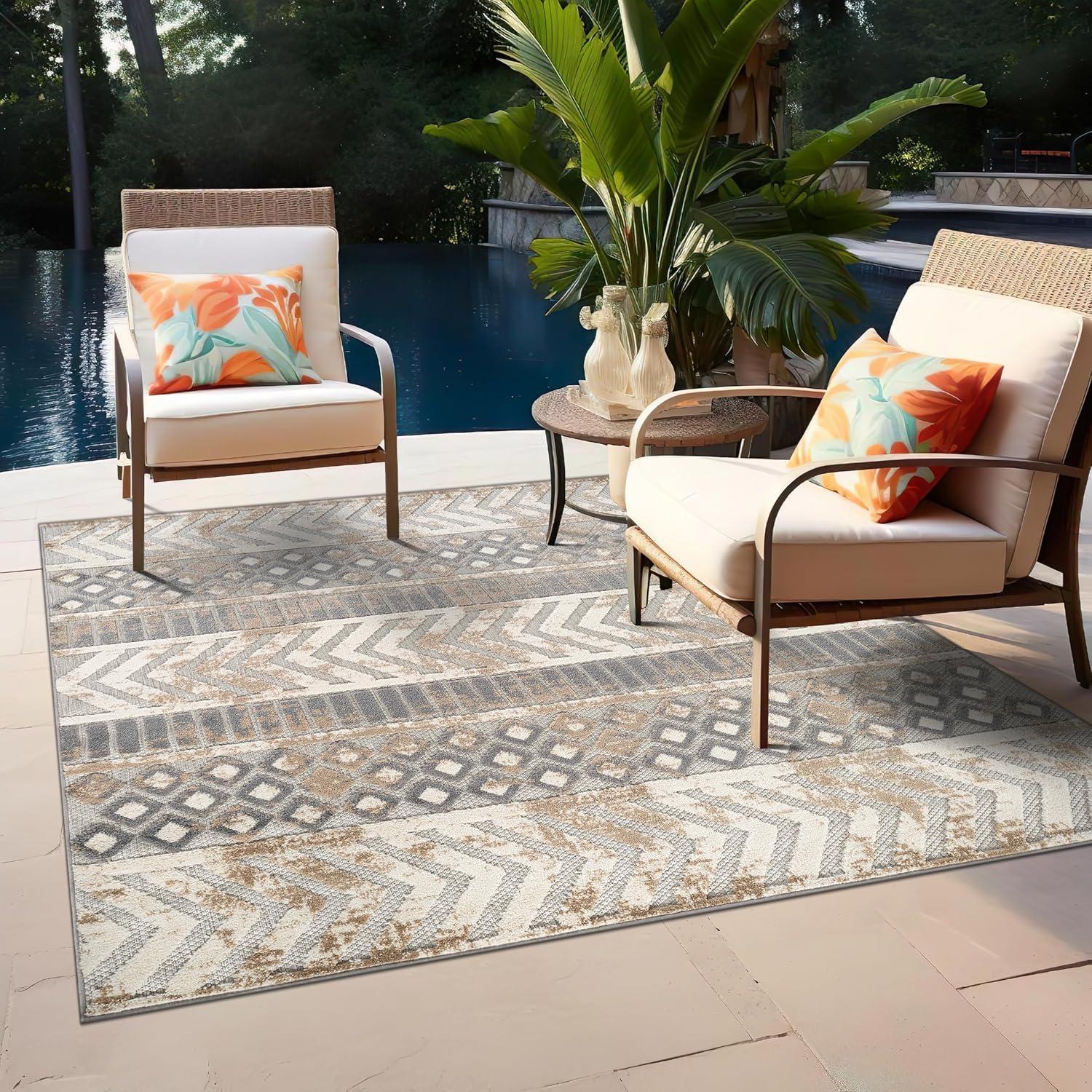 Rugshop Distressed Geometric Indoor/Outdoor Beige Area Rug Modern Tribal Stripe, Durable Stain Resistant Perfect for Patio, Backyard, Deck and Outdoor Lounge 5′ x 7′(Beige)