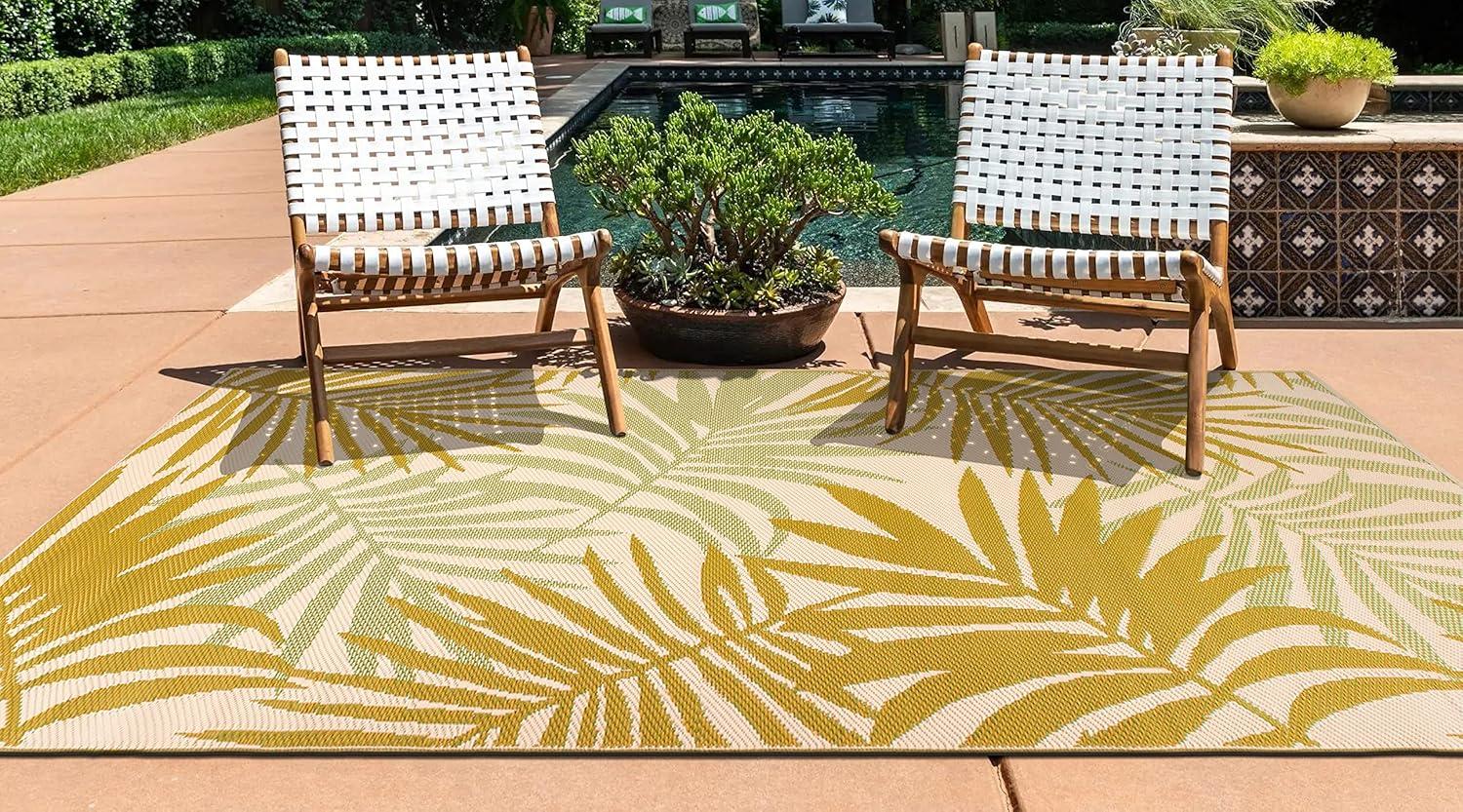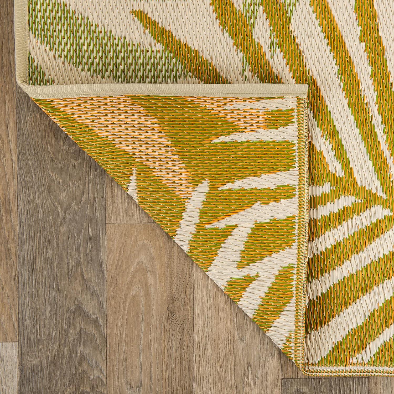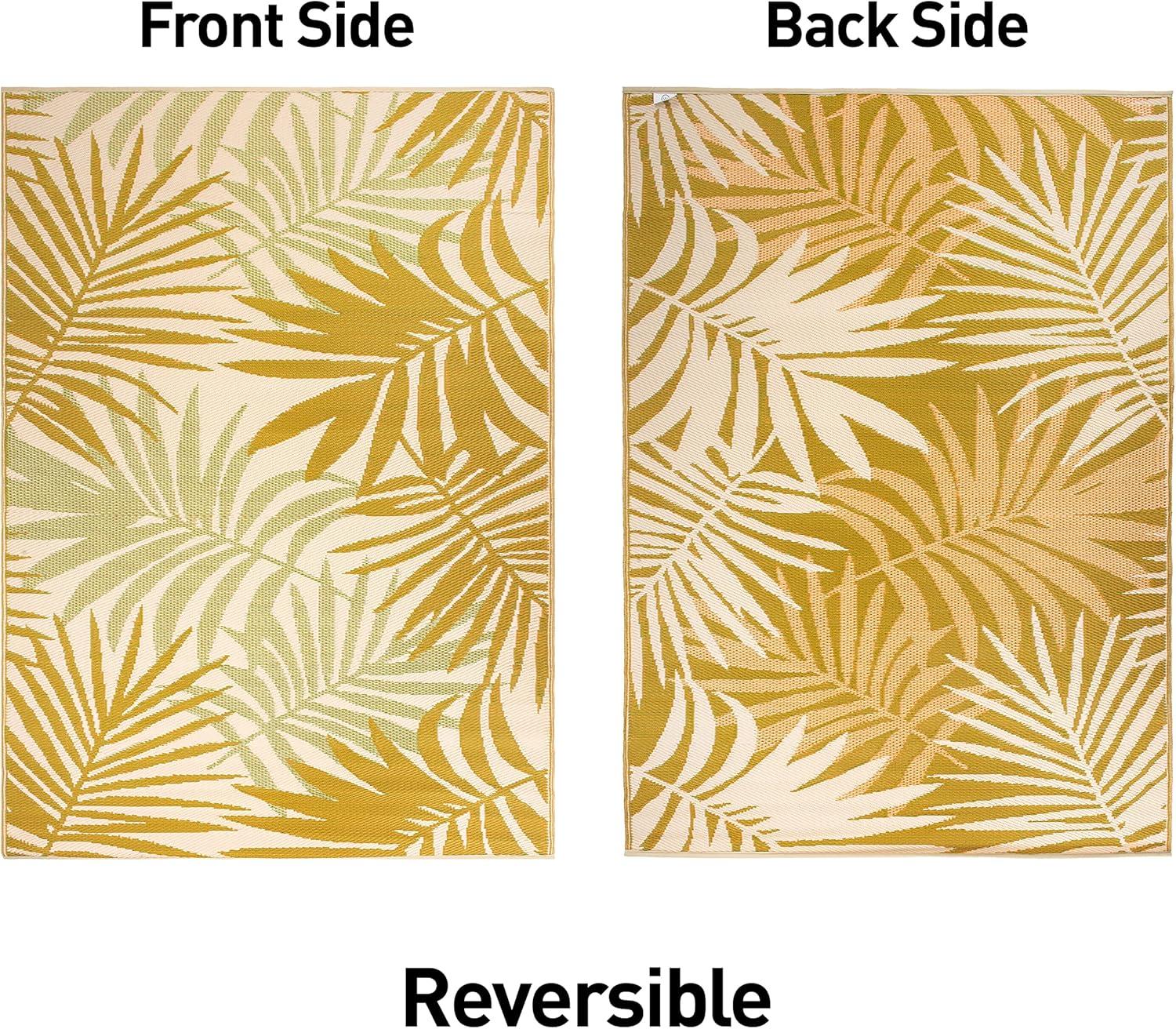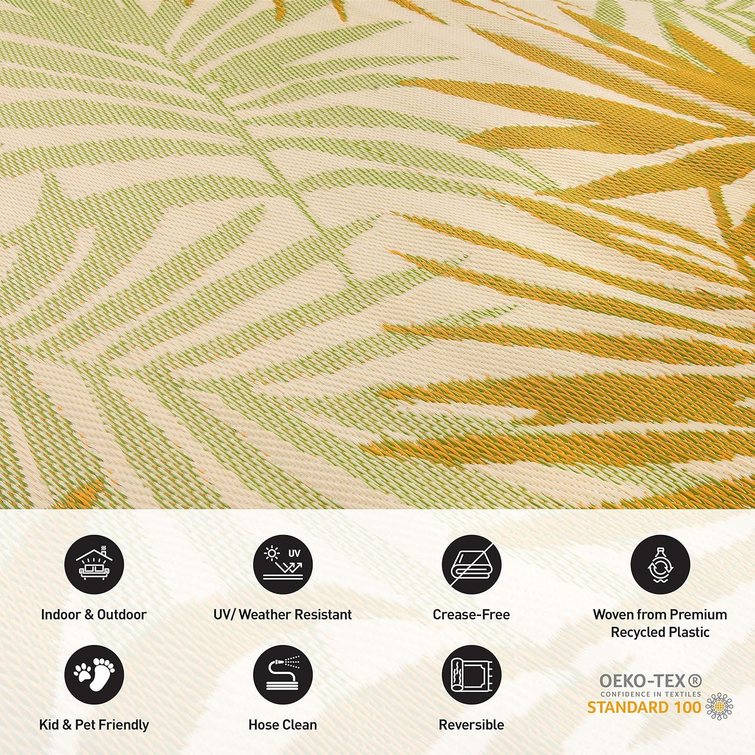 Experience the comfort, durability and versatility of this reversible straw rug inside or outside of your home.This rug is Machine made in India, by using 100% polypropylene. Dual usage of this rug enables it to be easily cleaned. The floral tropical palm pattern add visual glare to any space. Great for Patios, RVs, camping, patio decks, sunroom, playrooms, pet mats, kid’s mats, traveling, picnics, casual hikes, beach trips.