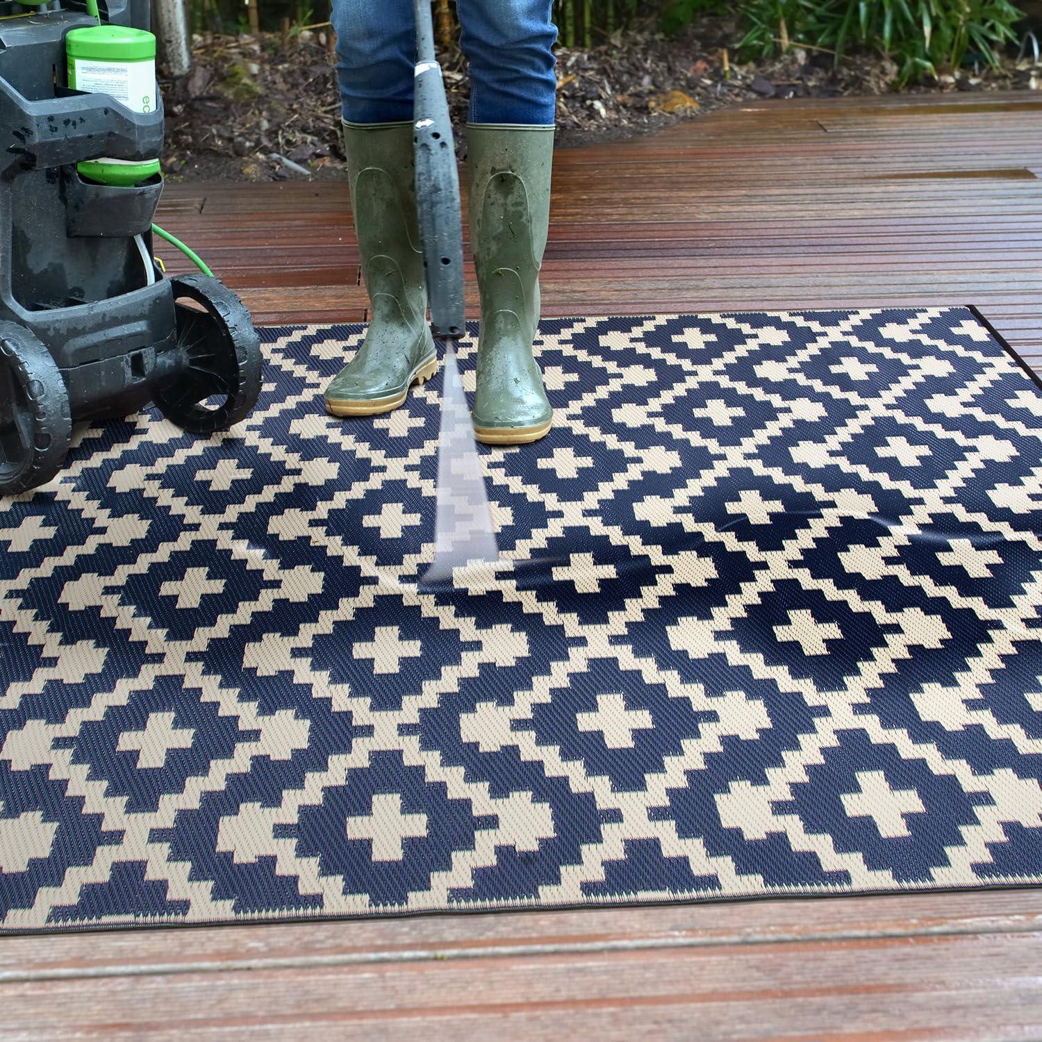 Care Instructions: Indoor/Outdoor rugs can be cleaned with a bit more vigor than regular rugs. Rinsing a rug with a garden hose is an excellent way to blast away excessive grime.Dry indoor-outdoor rugs over a railing in the sunlight on both sides instead of placing it on a wooden deck or stone patio, this can encourage the growth of moss or mold on a damp rug.