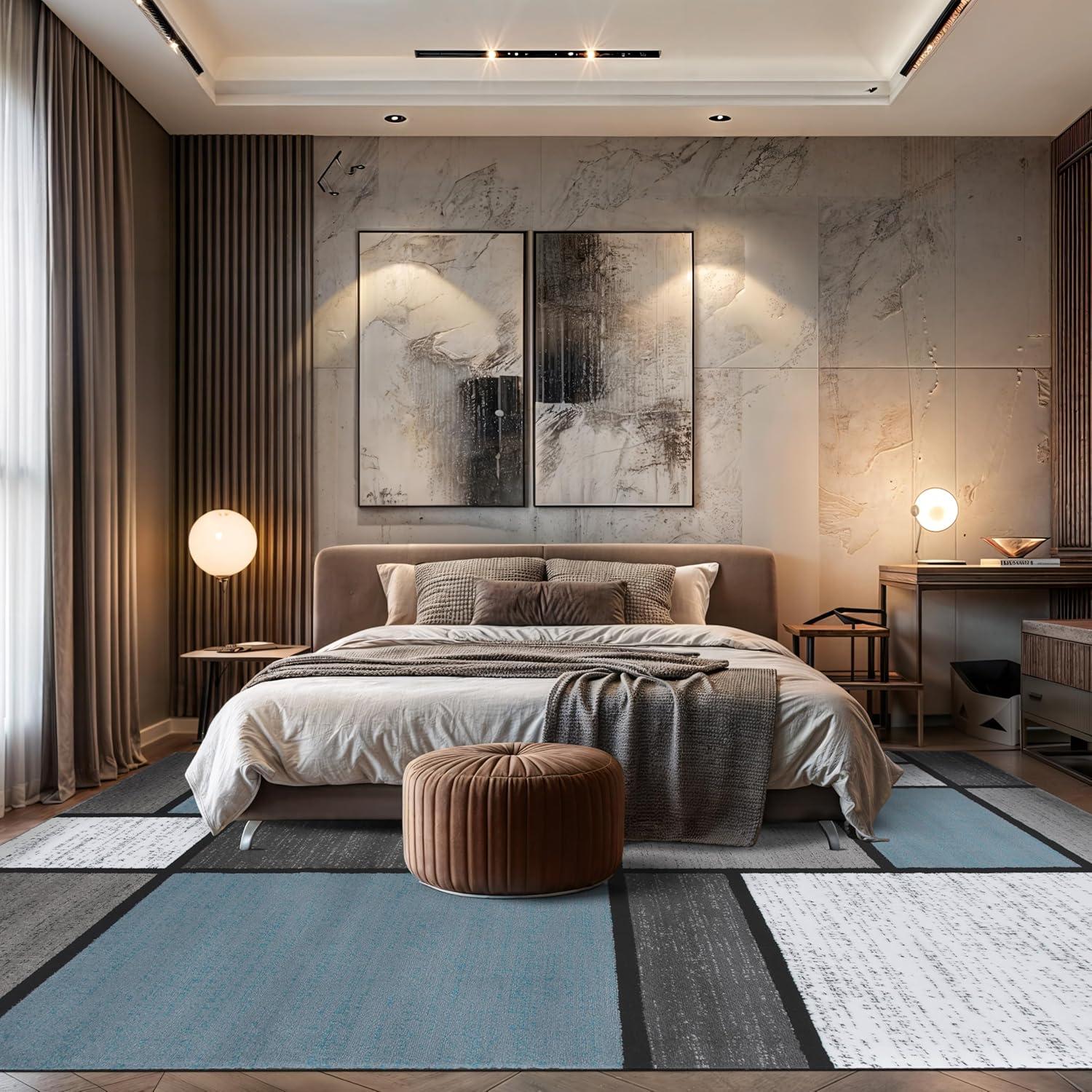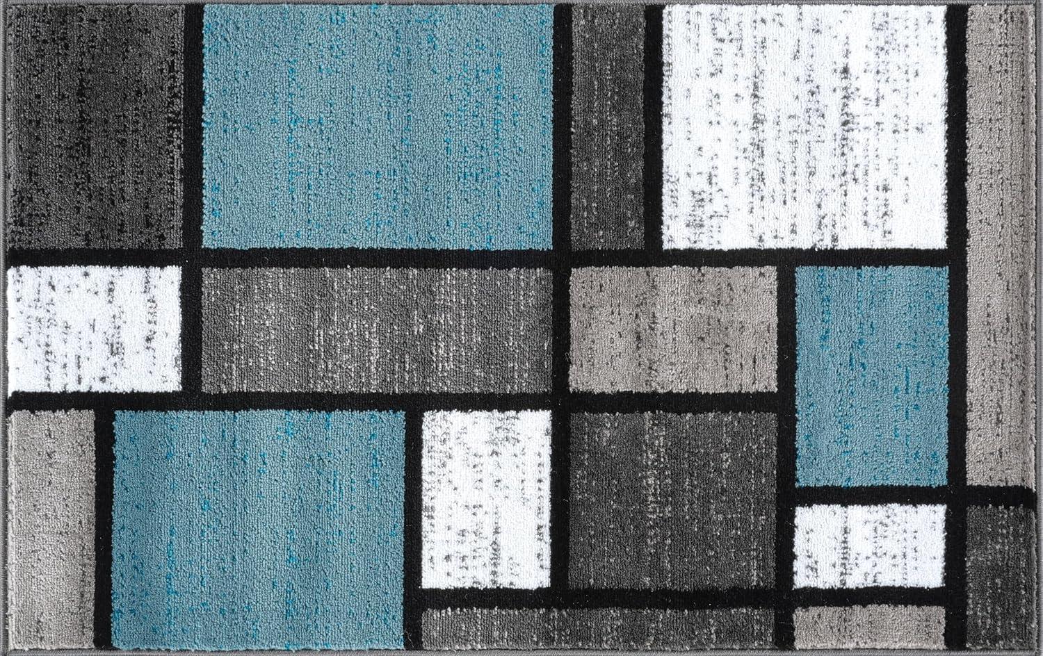 Modern geometric design: Inspired by Mondrian-style box patterns, this rug features intersecting rectangles in layered tones of blue, ivory, and gray—adding structure and visual balance to any contemporary interior.