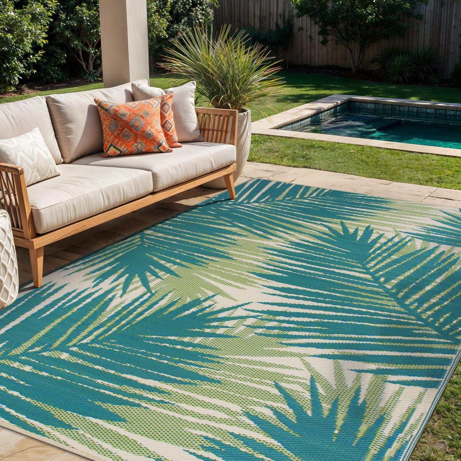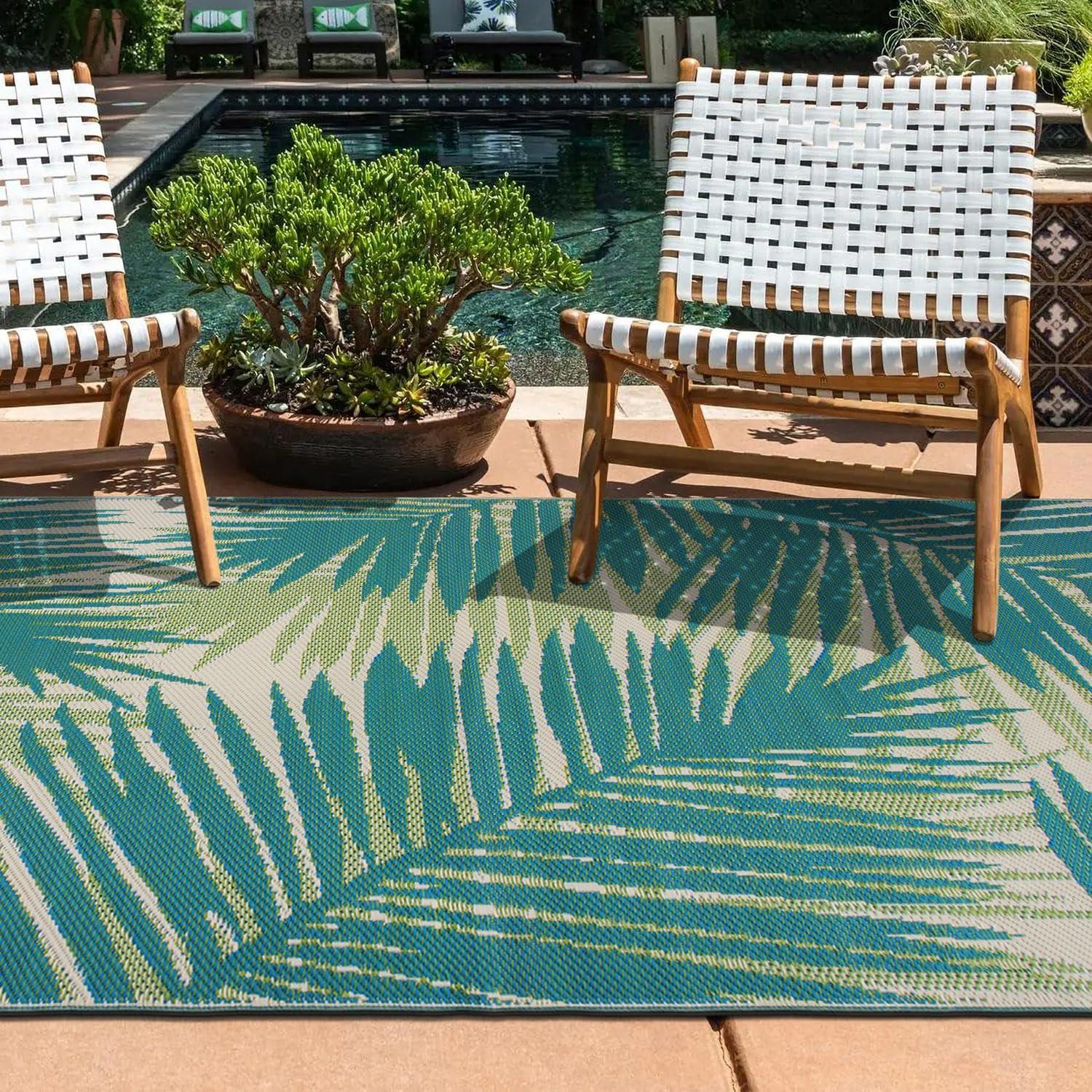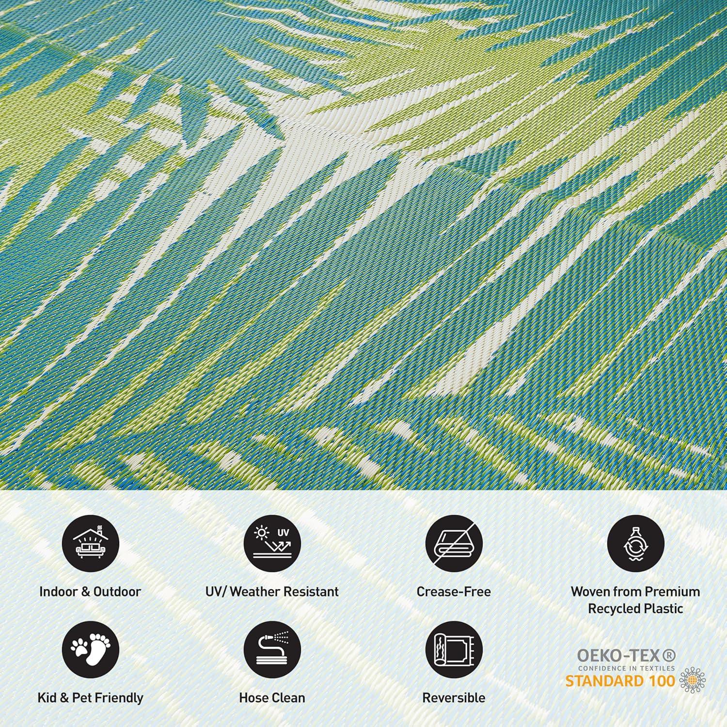 Rugshop Tropical Floral Reversible Crease-Free Waterproof Premium Recycled Plastic Outdoor Rugs for Patio,Backyard,RV,Deck,Picnic,Trailer,Beach,Camping Blue 5′ x 7′(Green)